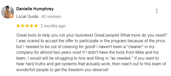 Either way, by the time we’re done with this call, you’re going to have a crystal clear path to building a $100k cleaning business, hiring a team of A-players, and get clients to pay in advance just to work with you…
